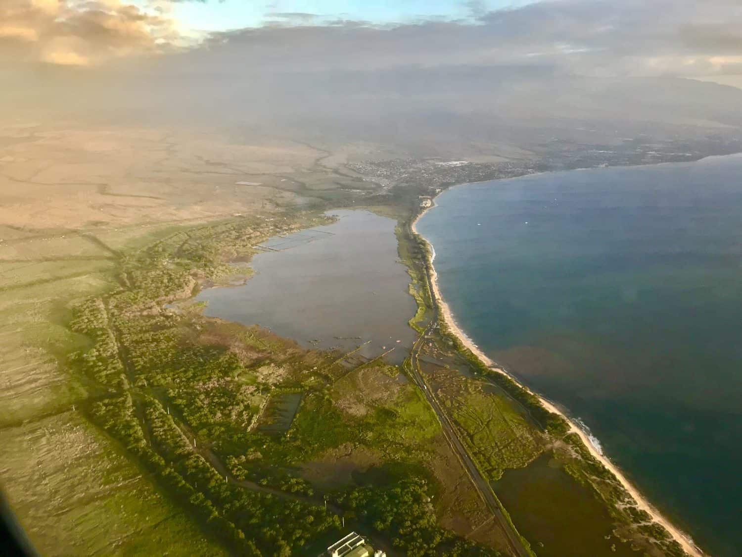 Kealia Pond on Maui, Hawaii is one of the few natural wetlands remaining in the Hawaiian Islands. It’s about 700 acres and is designated a National Wildlife Refuge. This is also a natural basin for a 56 mile watershed for the West Maui Mountains. For more info and visitor center click here. There is also a lovely boardwalk you can walk on to that goes over part of wetlands. Maui is not just beaches and waves but so many diverse climates and terrains for all nature enthusiasts. Photo taken by Jeannie Kong from a airplane flying over this beautiful area.