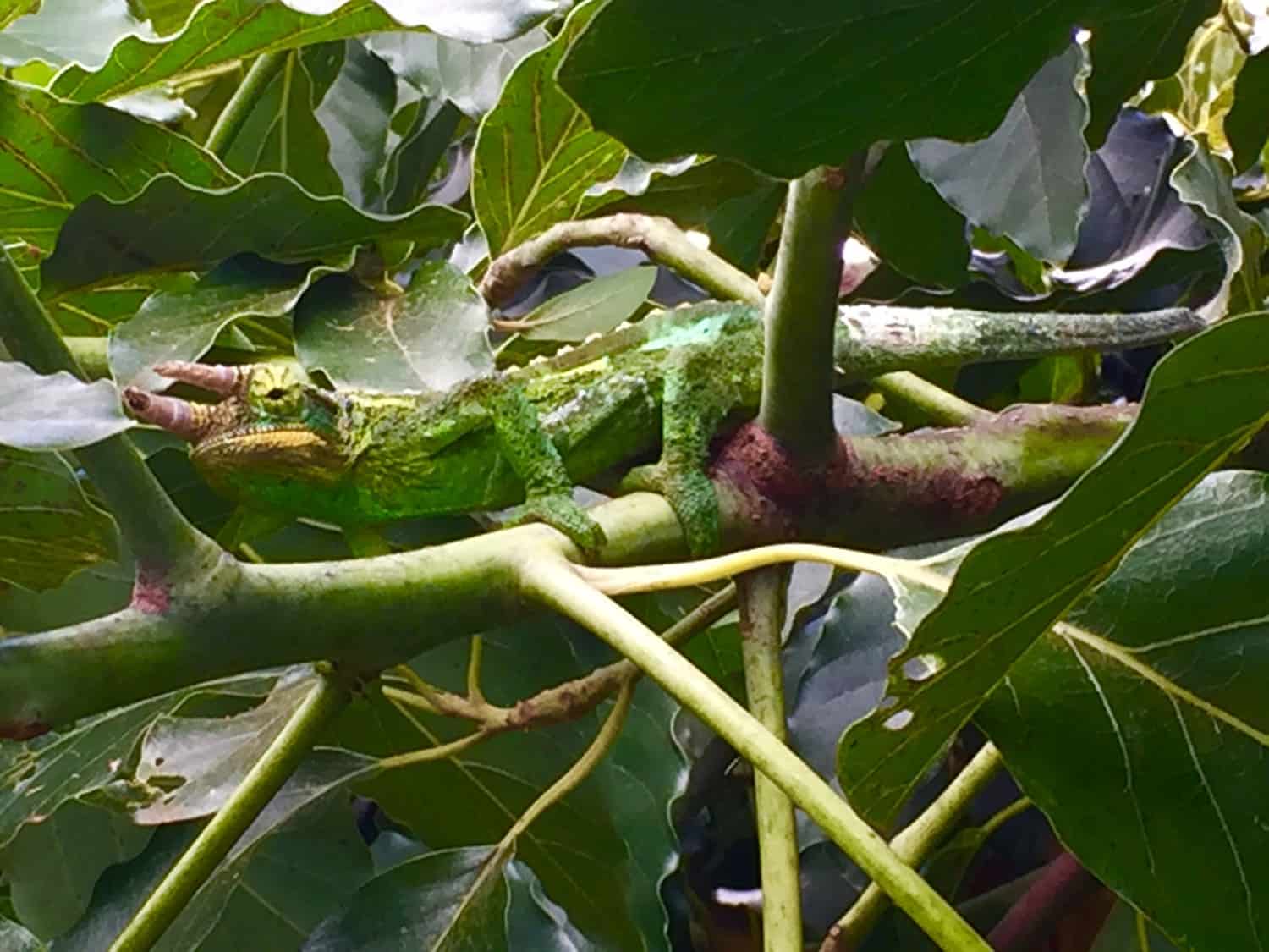 Although this Jackson Chameleon is in full Chamo I did find it hanging in the coolness of the Avocados at 109. Lower Kimo Home.