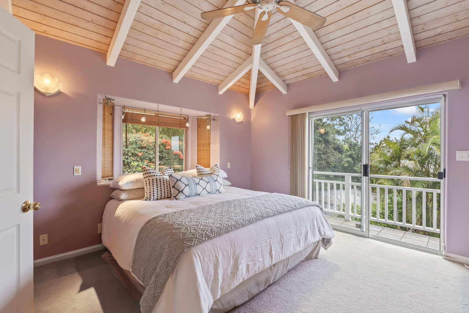 Upstairs, the primary bedroom suite is a peaceful haven with its private lanai, cedar-lined walk-in closet, jetted tub, and panoramic views from mountain to the ocean. Two additional upstairs bedrooms offer more options.