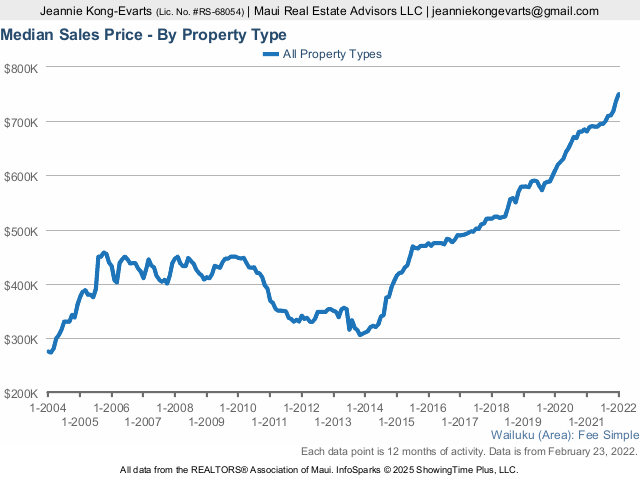 Median price for single family homes in the Wailuku Area of Maui, Hawaii.