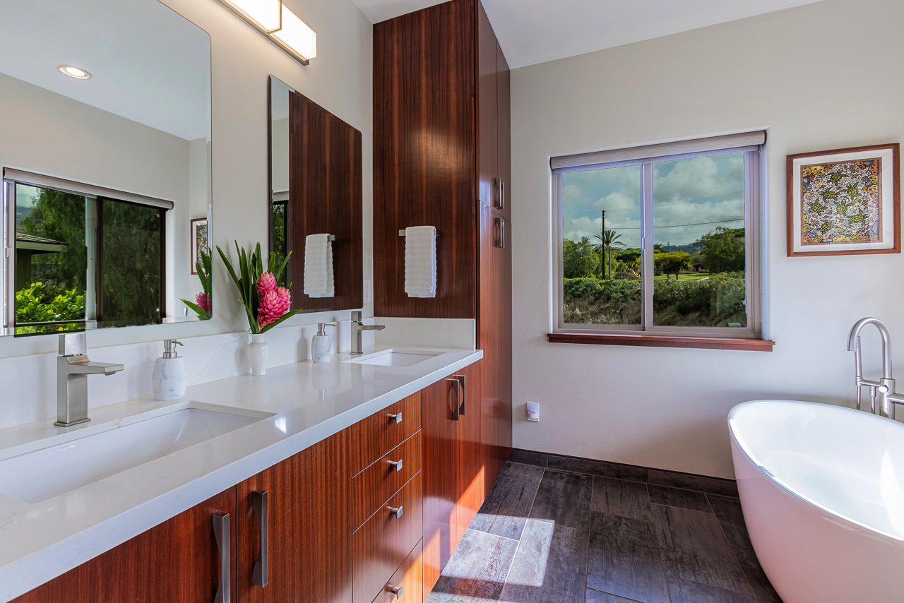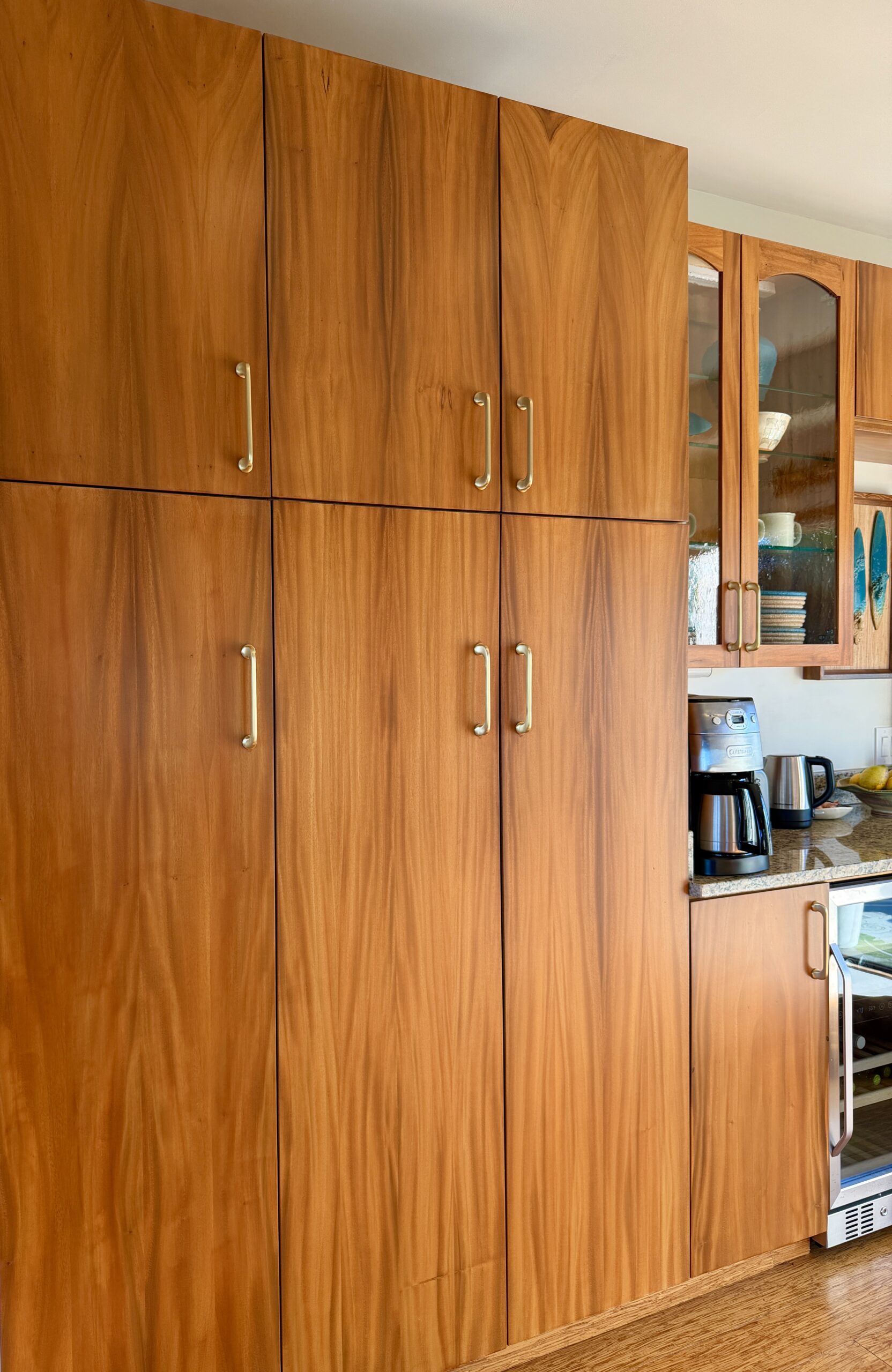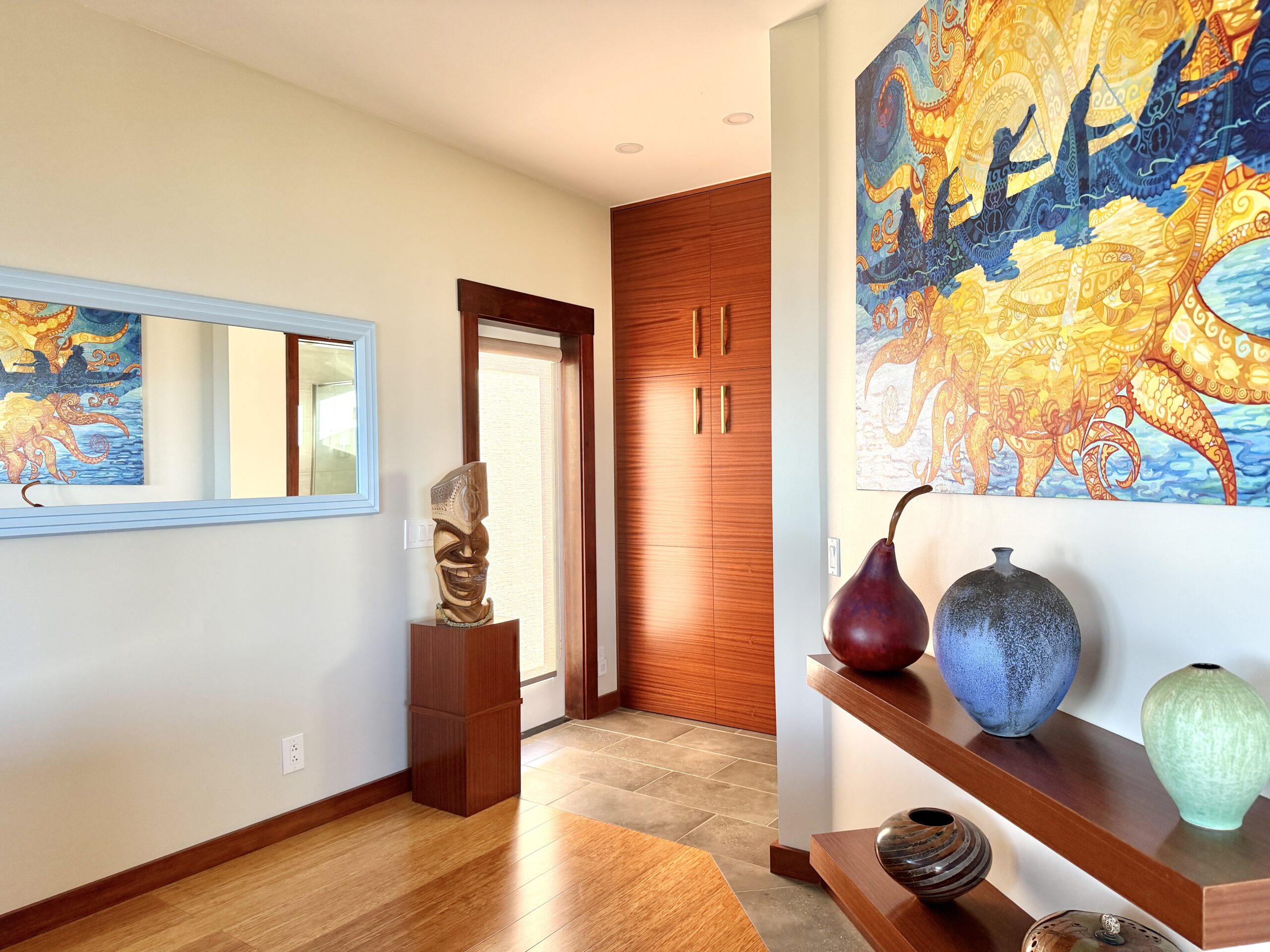 A signature feature: handcrafted, book-matched monkeypod cabinetry by master woodworker Clay Simpson—a functional work of art that elevates the home beyond “renovated” into something truly curated.